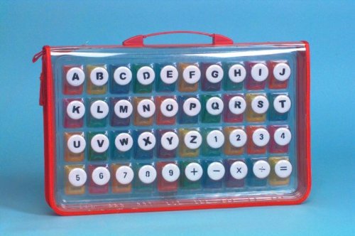 Letters & Numbers Set includes all the letters of the alphabet, numbers 1-9 and 5 math symbols. Comes in a convenient carrying cases with handle & zipper closure. The punched shapes vary in size but measure approx. 1/2" to 5/8" in diameter.